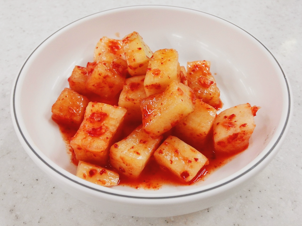 - 무를 깍둑 썰기로 자릅니다. 크기는 약 2~3cm로, 너무 크면 양념이 덜 배고 너무 작으면 숙성 중 물러질 수 있으니 적당히 썰어야 합니다.